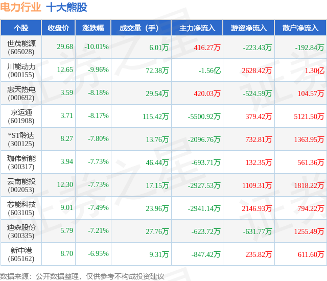 个股表现方面,电力行业当日领跌股为世茂能源(605028),该股当日报收29.68,下跌10.01%,成交量6.01万,主力资金净流入416.27万元。川能动力(000155)以下跌9.96%紧随其后,该股当日成交量72.38万,主力资金净流出1.56亿元。除此之外,惠天热电(000692)、京运通(601908)、*ST聆达(300125)均进入当日熊股之列。具体个股列表见下表: