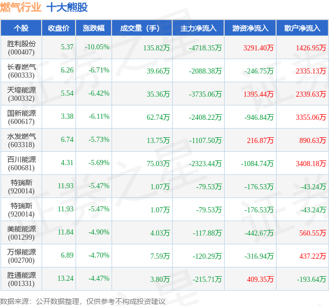 个股表现方面,燃气行业当日领跌股为胜利股份(000407),该股当日报收5.37,下跌10.05%,成交量135.82万,主力资金净流出4718.35万元。长春燃气(600333)以下跌6.71%紧随其后,该股当日成交量39.66万,主力资金净流出2088.38万元。除此之外,天壕能源(300332)、国新能源(600617)、水发燃气(603318)均进入当日熊股之列。具体个股列表见下表: