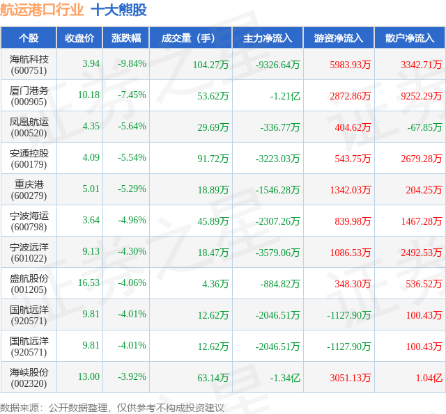 个股表现方面,航运港口行业当日领跌股为海航科技(600751),该股当日报收3.94,下跌9.84%,成交量104.27万,主力资金净流出9326.64万元。厦门港务(000905)以下跌7.45%紧随其后,该股当日成交量53.62万,主力资金净流出1.21亿元。除此之外,凤凰航运(000520)、安通控股(600179)、重庆港(600279)均进入当日熊股之列。具体个股列表见下表: