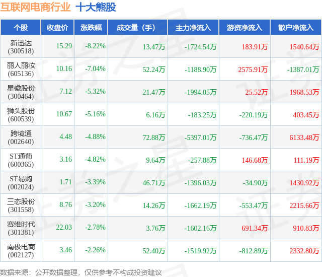 个股表现方面,互联网电商行业当日领跌股为新迅达(300518),该股当日报收15.29,下跌8.22%,成交量13.47万,主力资金净流出1724.54万元。丽人丽妆(605136)以下跌7.04%紧随其后,该股当日成交量52.24万,主力资金净流出1188.9万元。除此之外,星徽股份(300464)、狮头股份(600539)、跨境通(002640)均进入当日熊股之列。具体个股列表见下表: