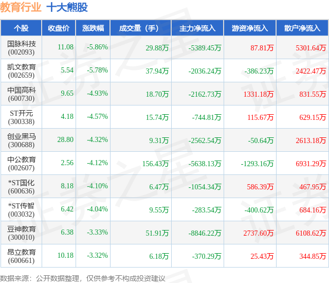 个股表现方面,教育行业当日领跌股为国脉科技(002093),该股当日报收11.08,下跌5.86%,成交量29.88万,主力资金净流出5389.45万元。凯文教育(002659)以下跌5.78%紧随其后,该股当日成交量37.94万,主力资金净流出2036.24万元。除此之外,中国高科(600730)、ST开元(300338)、创业黑马(300688)均进入当日熊股之列。具体个股列表见下表: