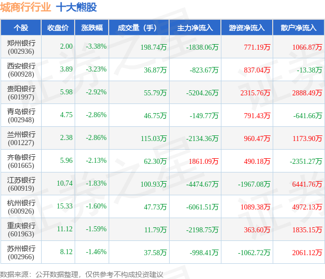 个股表现方面,城商行行业当日领跌股为郑州银行(002936),该股当日报收2.0,下跌3.38%,成交量198.74万,主力资金净流出1838.06万元。西安银行(600928)以下跌3.23%紧随其后,该股当日成交量36.87万,主力资金净流出823.67万元。除此之外,贵阳银行(601997)、青岛银行(002948)、兰州银行(001227)均进入当日熊股之列。具体个股列表见下表: