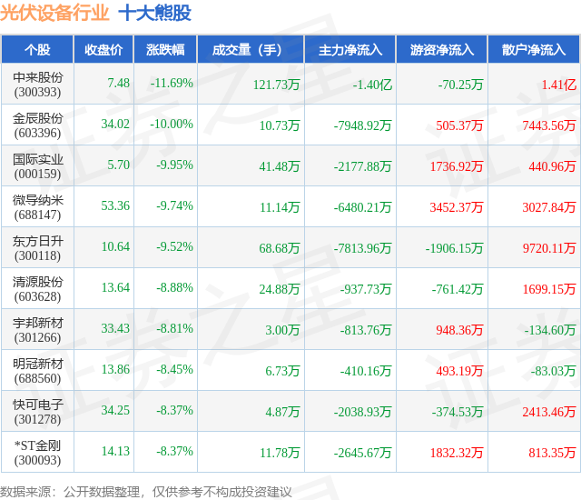 个股表现方面,光伏设备行业当日领跌股为中来股份(300393),该股当日报收7.48,下跌11.69%,成交量121.73万,主力资金净流出1.4亿元。金辰股份(603396)以下跌10.0%紧随其后,该股当日成交量10.73万,主力资金净流出7948.92万元。除此之外,国际实业(000159)、微导纳米(688147)、东方日升(300118)均进入当日熊股之列。具体个股列表见下表: