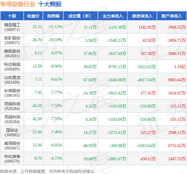 个股表现方面,专用设备行业当日领跌股为博亚精工(300971),该股当日报收23.31,下跌11.13%,成交量11.11万,主力资金净流出5111.3万元。浙矿股份(300837)以下跌10.1%紧随其后,该股当日成交量5.94万,主力资金净流出3540.21万元。除此之外,冀凯股份(002691)、科达制造(600499)、山东墨龙(002490)均进入当日熊股之列。具体个股列表见下表: