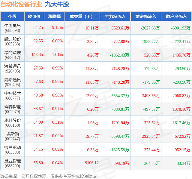 个股表现方面,自动化设备行业当日领涨股为伟创电气(688698),该股当日报收84.25,上涨9.13%,成交量10.11万,主力资金净流入6529.61万元。凯迪股份(605288)以上涨6.0%紧随其后,该股当日成交量3.82万,主力资金净流入2727.88万元。除此之外,绿的谐波(688017)、海希通讯(920405)、海希通讯(920405)均进入当日牛股之列。具体个股列表见下表: