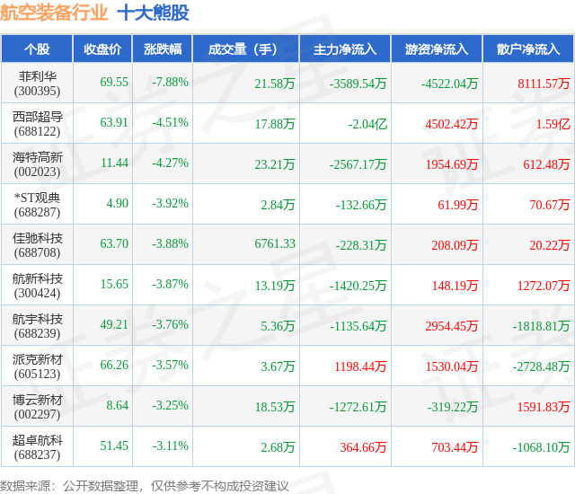 个股表现方面,航空装备行业当日领跌股为菲利华(300395),该股当日报收69.55,下跌7.88%,成交量21.58万,主力资金净流出3589.54万元。西部超导(688122)以下跌4.51%紧随其后,该股当日成交量17.88万,主力资金净流出2.04亿元。除此之外,海特高新(002023)、*ST观典(688287)、佳驰科技(688708)均进入当日熊股之列。具体个股列表见下表: