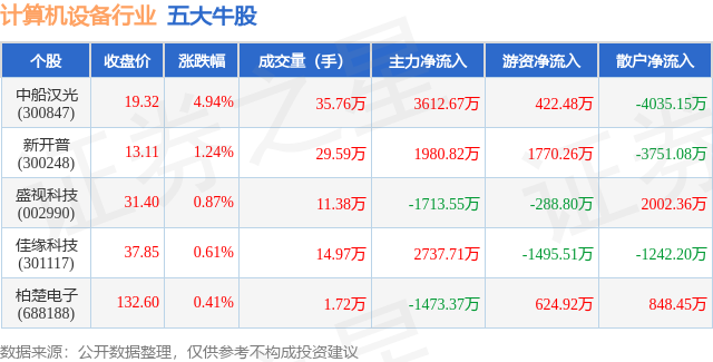 个股表现方面,计算机设备行业当日领涨股为中船汉光(300847),该股当日报收19.32,上涨4.94%,成交量35.76万,主力资金净流入3612.67万元。新开普(300248)以上涨1.24%紧随其后,该股当日成交量29.59万,主力资金净流入1980.82万元。除此之外,盛视科技(002990)、佳缘科技(301117)、柏楚电子(688188)均进入当日牛股之列。具体个股列表见下表: