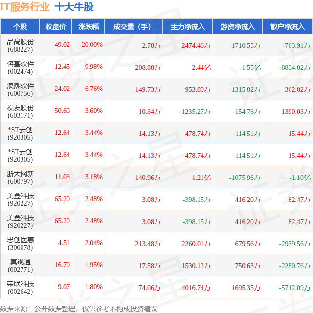 个股表现方面,IT服务行业当日领涨股为品高股份(688227),该股当日报收49.02,上涨20.0%,成交量2.78万,主力资金净流入2474.46万元。榕基软件(002474)以上涨9.98%紧随其后,该股当日成交量208.88万,主力资金净流入2.44亿元。除此之外,浪潮软件(600756)、税友股份(603171)、*ST云创(920305)均进入当日牛股之列。具体个股列表见下表: