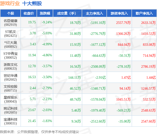 个股表现方面,游戏行业当日领跌股为名臣健康(002919),该股当日报收19.75,下跌9.24%,成交量18.7万,主力资金净流出5191.1万元。ST凯文(002425)以下跌5.03%紧随其后,该股当日成交量31.8万,主力资金净流出2776.79万元。除此之外,*ST大晟(600892)、ST中青宝(300052)、浙数文化(600633)均进入当日熊股之列。具体个股列表见下表: