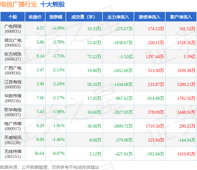 个股表现方面,电视广播行业当日领跌股为广电网络(600831),该股当日报收4.57,下跌4.99%,成交量19.33万,主力资金净流出275.67万元。湖北广电(000665)以下跌3.78%紧随其后,该股当日成交量53.42万,主力资金净流出1838.67万元。除此之外,东方明珠(600637)、广西广电(600936)、江苏有线(600959)均进入当日熊股之列。具体个股列表见下表: