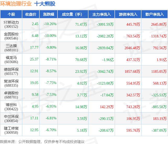 个股表现方面,环境治理行业当日领跌股为ST新动力(300152),该股当日报收2.45,下跌10.26%,成交量71.47万,主力资金净流出3091.59万元。金圆股份(000546)以下跌10.0%紧随其后,该股当日成交量13.12万,主力资金净流出2082.28万元。除此之外,三达膜(688101)、福龙马(603686)、德创环保(603177)均进入当日熊股之列。具体个股列表见下表: