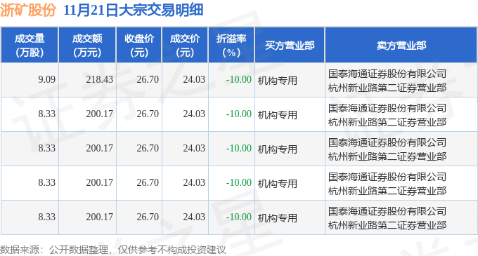 证券之星消息,11月21日浙矿股份发生大宗交易,交易数据如下: