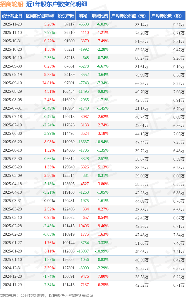 从股价来看,2025年11月10日至2025年11月20日,招商轮船区间涨幅为5.28%,在此期间股东户数减少5593.0户,减幅为6.03%。