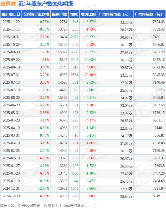 从股价来看,2025年11月10日至2025年11月20日,盛景微区间跌幅为0.75%,在此期间股东户数减少943.0户,减幅为6.87%。