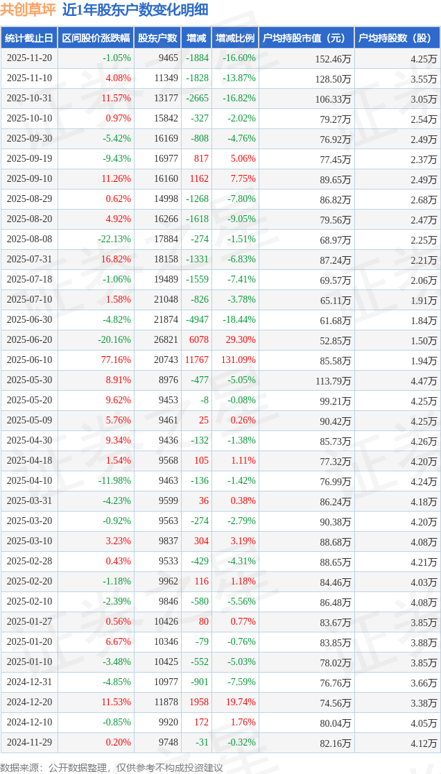 证券之星消息,近日共创草坪披露,截至2025年11月20日公司股东户数为9465.0户,较11月10日减少1884.0户,减幅为16.6%。户均持股数量由上期的3.55万股增加至4.25万股,户均持股市值为152.46万元。