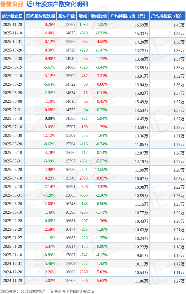 从股价来看,2025年11月10日至2025年11月20日,春雪食品区间涨幅为0.26%,在此期间股东户数减少1093.0户,减幅为7.35%。