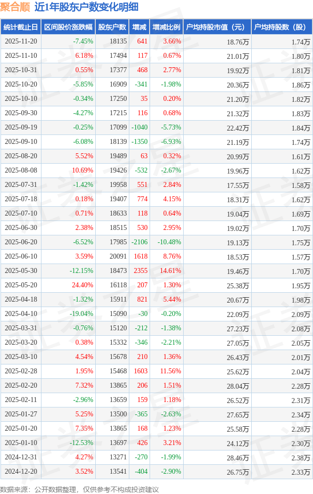 从股价来看,2025年11月10日至2025年11月20日,聚合顺区间跌幅为7.45%,在此期间股东户数增加641.0户,增幅为3.66%。