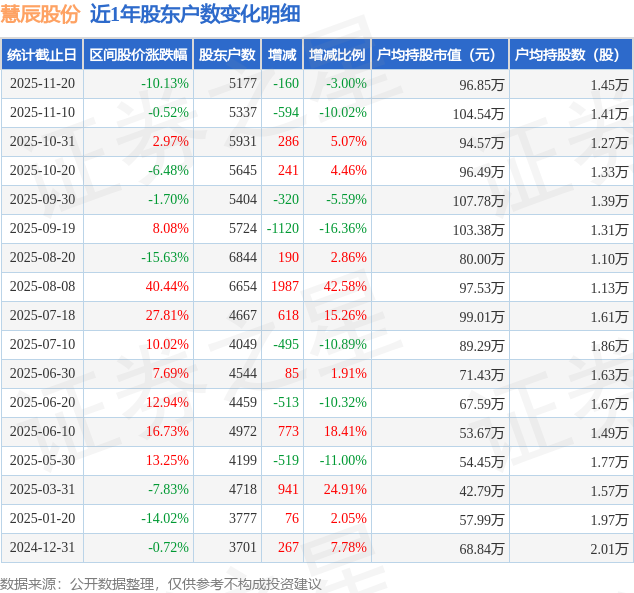 从股价来看,2025年11月10日至2025年11月20日,慧辰股份区间跌幅为10.13%,在此期间股东户数减少160.0户,减幅为3.0%。