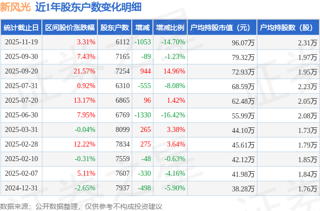 证券之星消息,近日新风光披露,截至2025年11月19日公司股东户数为6112.0户,较9月30日减少1053.0户,减幅为14.7%。户均持股数量由上期的1.97万股增加至2.31万股,户均持股市值为96.07万元。