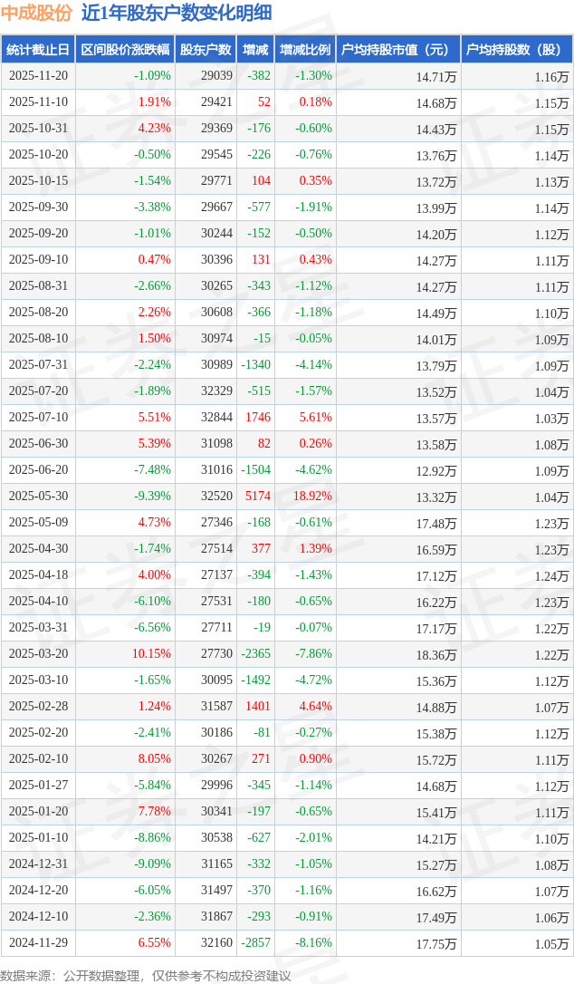 从股价来看,2025年11月10日至2025年11月20日,中成股份区间跌幅为1.09%,在此期间股东户数减少382.0户,减幅为1.3%。