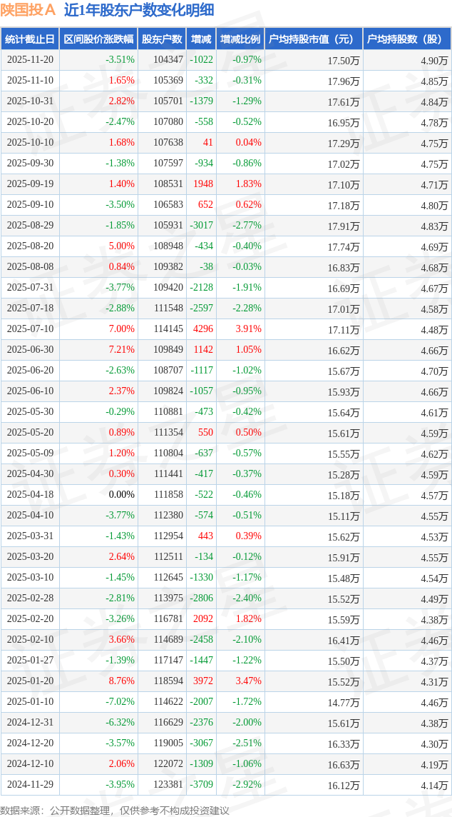 从股价来看,2025年11月10日至2025年11月20日,陕国投A区间跌幅为3.51%,在此期间股东户数减少1022.0户,减幅为0.97%。