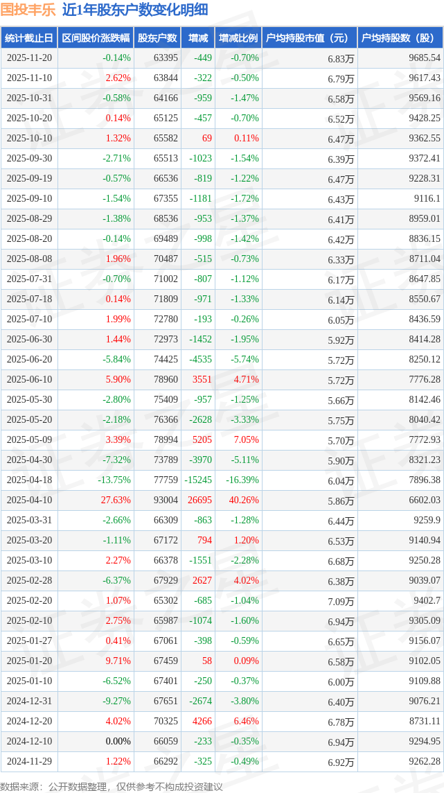 从股价来看,2025年11月10日至2025年11月20日,国投丰乐区间跌幅为0.14%,在此期间股东户数减少449.0户,减幅为0.7%。
