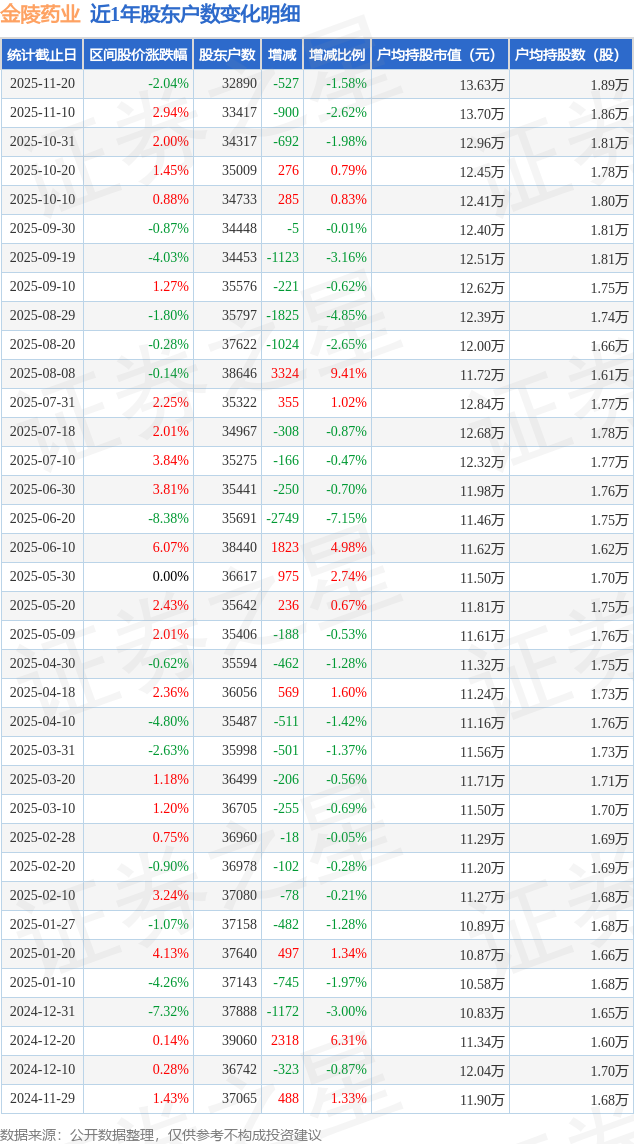 从股价来看,2025年11月10日至2025年11月20日,金陵药业区间跌幅为2.04%,在此期间股东户数减少527.0户,减幅为1.58%。