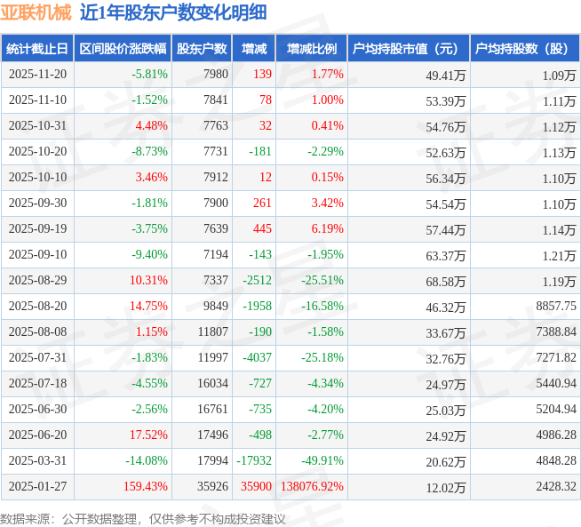 从股价来看,2025年11月10日至2025年11月20日,亚联机械区间跌幅为5.81%,在此期间股东户数增加139.0户,增幅为1.77%。