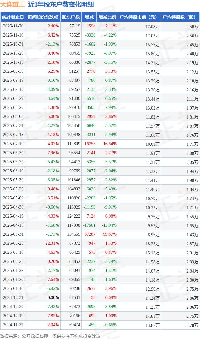 从股价来看,2025年11月10日至2025年11月20日,大连重工区间涨幅为2.4%,在此期间股东户数增加1594.0户,增幅为2.11%。