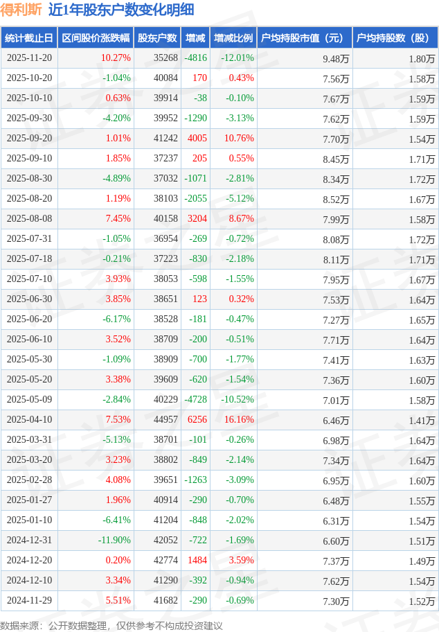 从股价来看,2025年10月20日至2025年11月20日,得利斯区间涨幅为10.27%,在此期间股东户数减少4816.0户,减幅为12.01%。