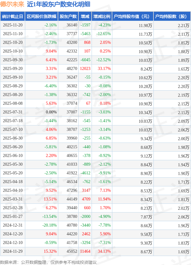 从股价来看,2025年11月10日至2025年11月20日,德尔未来区间跌幅为2.16%,在此期间股东户数减少1597.0户,减幅为4.23%。