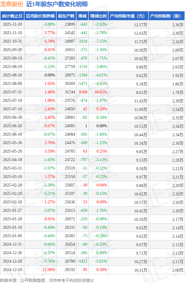 从股价来看,2025年11月10日至2025年11月20日,龙泉股份区间跌幅为3.09%,在此期间股东户数减少643.0户,减幅为2.62%。