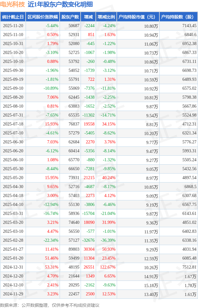 从股价来看,2025年11月10日至2025年11月20日,电光科技区间跌幅为5.44%,在此期间股东户数减少2244.0户,减幅为4.24%。