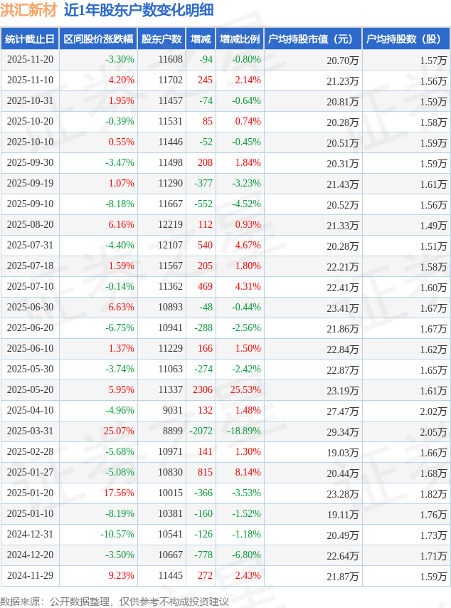 从股价来看,2025年11月10日至2025年11月20日,洪汇新材区间跌幅为3.3%,在此期间股东户数减少94.0户,减幅为0.8%。