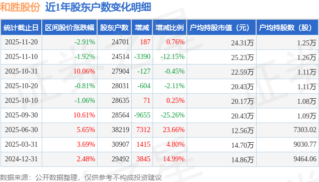 从股价来看,2025年11月10日至2025年11月20日,和胜股份区间跌幅为2.91%,在此期间股东户数增加187.0户,增幅为0.76%。