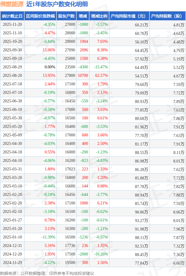 从股价来看,2025年11月10日至2025年11月20日,佛燃能源区间跌幅为4.35%,在此期间股东户数减少1000.0户,减幅为3.57%。