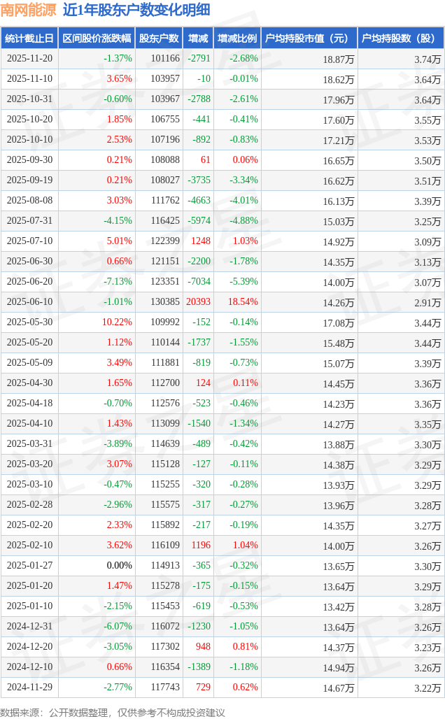 从股价来看,2025年11月10日至2025年11月20日,南网能源区间跌幅为1.37%,在此期间股东户数减少2791.0户,减幅为2.68%。