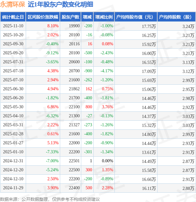 从股价来看,2025年10月20日至2025年11月10日,永清环保区间涨幅为8.1%,在此期间股东户数减少200.0户,减幅为1.0%。