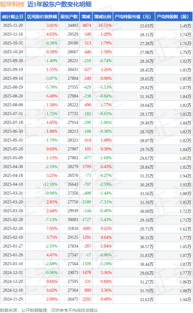 从股价来看,2025年11月10日至2025年11月20日,炬华科技区间涨幅为3.01%,在此期间股东户数增加4874.0户,增幅为16.51%。