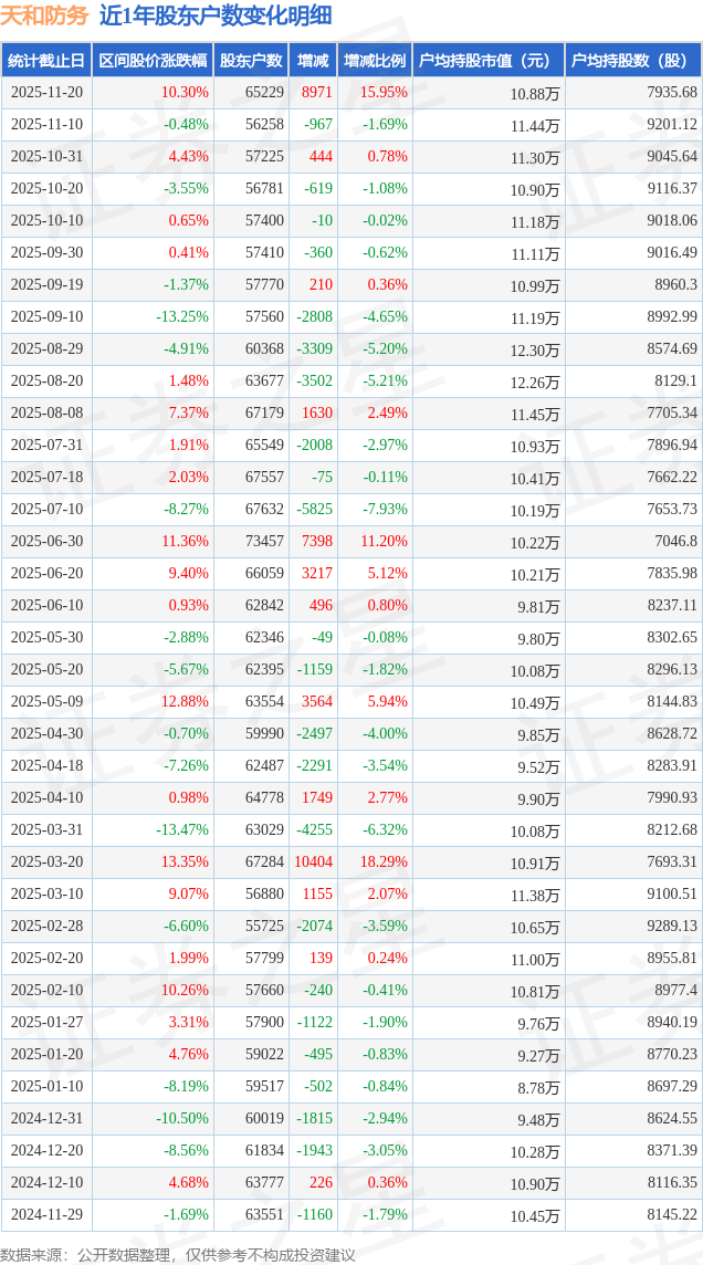 从股价来看,2025年11月10日至2025年11月20日,天和防务区间涨幅为10.3%,在此期间股东户数增加8971.0户,增幅为15.95%。