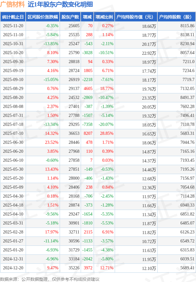 从股价来看,2025年11月10日至2025年11月20日,广信材料区间跌幅为0.35%,在此期间股东户数增加70.0户,增幅为0.27%。