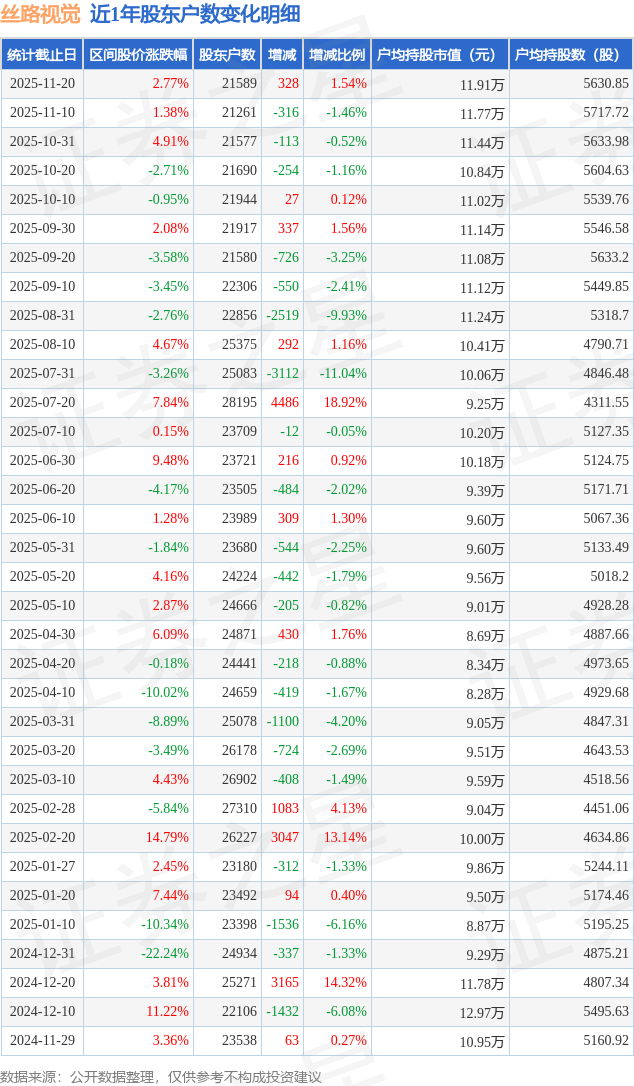 从股价来看,2025年11月10日至2025年11月20日,丝路视觉区间涨幅为2.77%,在此期间股东户数增加328.0户,增幅为1.54%。