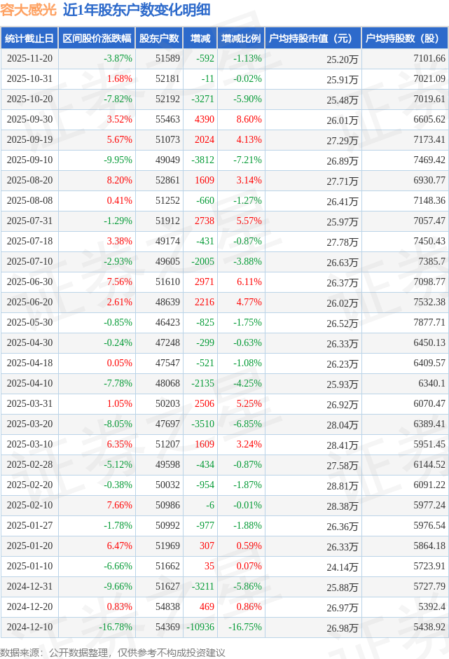 从股价来看,2025年10月31日至2025年11月20日,容大感光区间跌幅为3.87%,在此期间股东户数减少592.0户,减幅为1.13%。