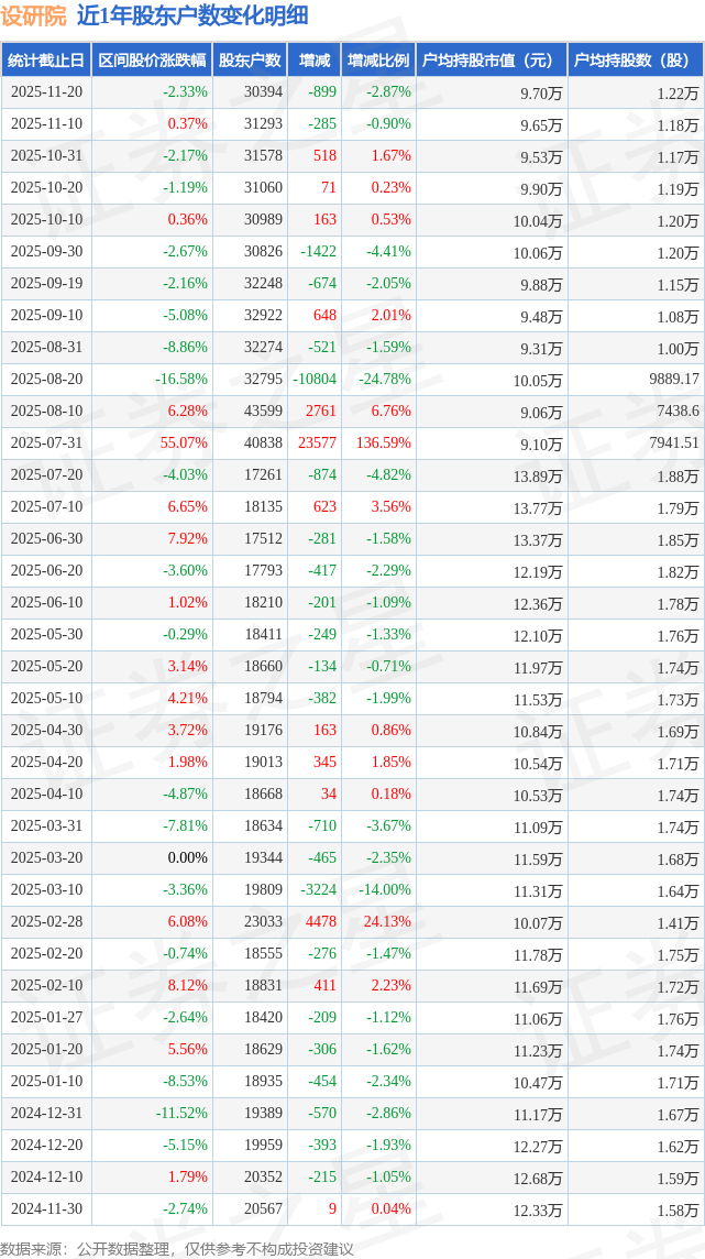 从股价来看,2025年11月10日至2025年11月20日,设研院区间跌幅为2.33%,在此期间股东户数减少899.0户,减幅为2.87%。