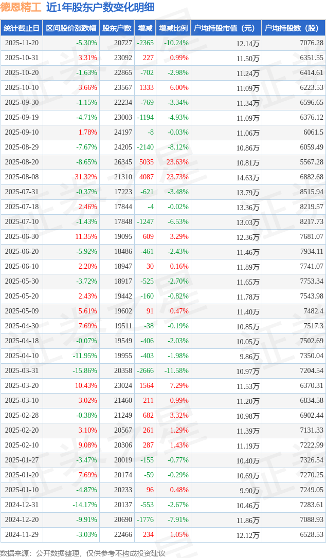 从股价来看,2025年10月31日至2025年11月20日,德恩精工区间跌幅为5.3%,在此期间股东户数减少2365.0户,减幅为10.24%。
