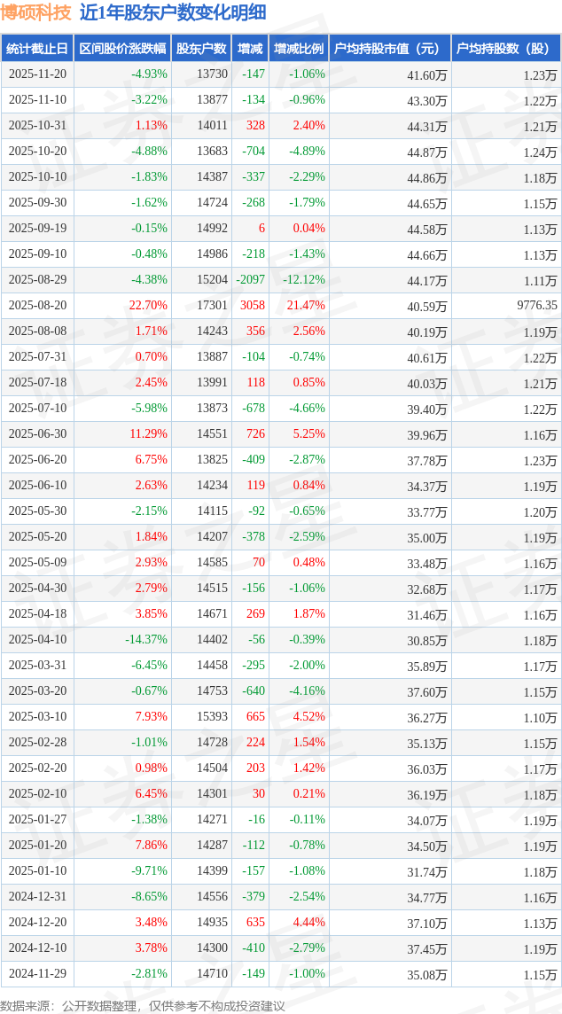 从股价来看,2025年11月10日至2025年11月20日,博硕科技区间跌幅为4.93%,在此期间股东户数减少147.0户,减幅为1.06%。