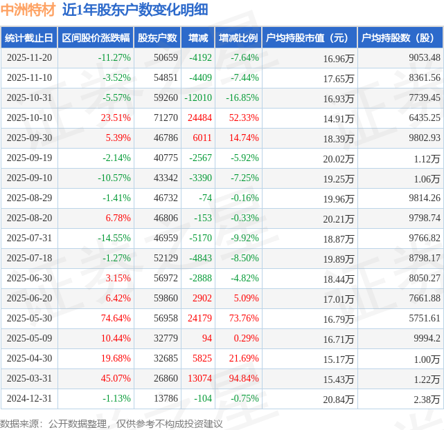 从股价来看,2025年11月10日至2025年11月20日,中洲特材区间跌幅为11.27%,在此期间股东户数减少4192.0户,减幅为7.64%。