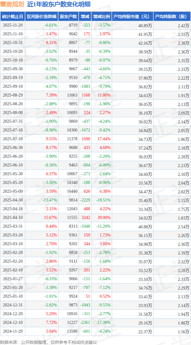 从股价来看,2025年11月10日至2025年11月20日,蕾奥规划区间跌幅为6.01%,在此期间股东户数减少323.0户,减幅为3.57%。
