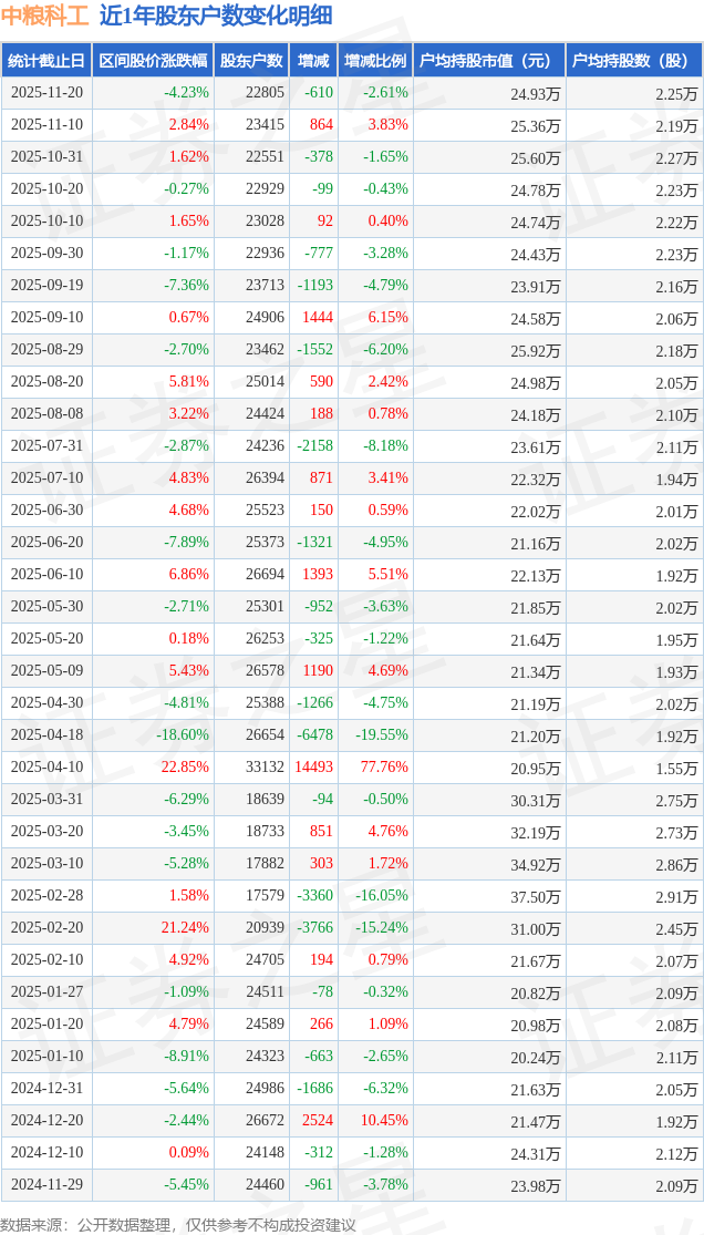 从股价来看,2025年11月10日至2025年11月20日,中粮科工区间跌幅为4.23%,在此期间股东户数减少610.0户,减幅为2.61%。