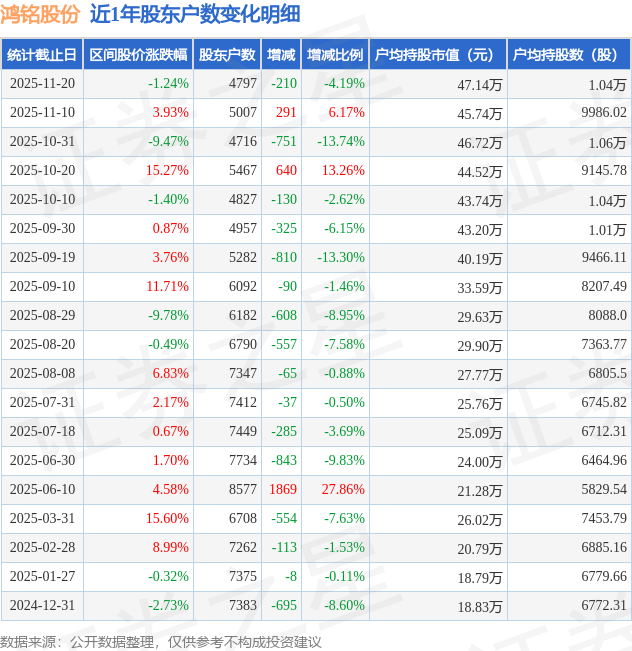 从股价来看,2025年11月10日至2025年11月20日,鸿铭股份区间跌幅为1.24%,在此期间股东户数减少210.0户,减幅为4.19%。